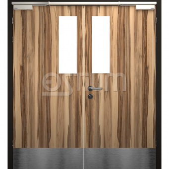 Двустворчатая противопожарная дверь с остеклением и отбойниками. Стандарт огнестойкости EI30, шумоизоляция 42 dB.