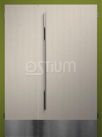 Присутствие остекления создает эффект простора и визуальной легкости, пропуская достаточно естественного света, что особенно ценно в помещениях с низкой освещенностью. Отбойник из нержавеющей стали предохраняет дверь от повреждений, обеспечивая ее эстетичный вид в течение длительного времени.