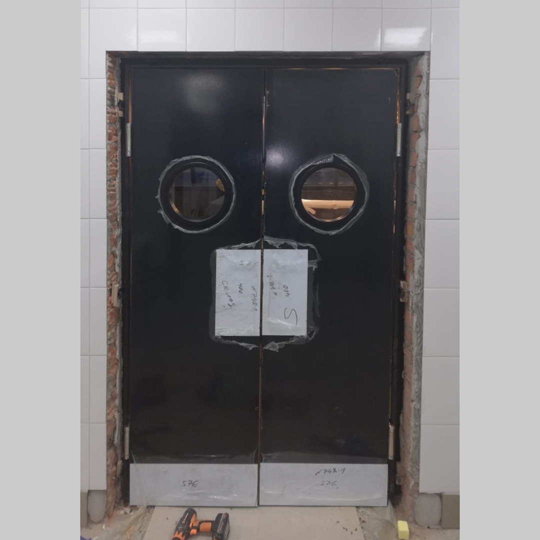 На объекте общественного питания (ресторан) компании ООО “ДЕЛЬТА” были установлены: маятниковая одностворчатая антивандальная остекленная дверь в кухню ресторана, маятниковая двустворчатая антивандальная остекленная дверь в гостевую зону ресторана. Двери облицованы высокопрочным пластиком черного цвета. Наша компания изготавливает качественные маятниковые двери, использует усиленные маятниковые петли, существуют и дизайнерские варианты (маятниковые дизайнерские двери).